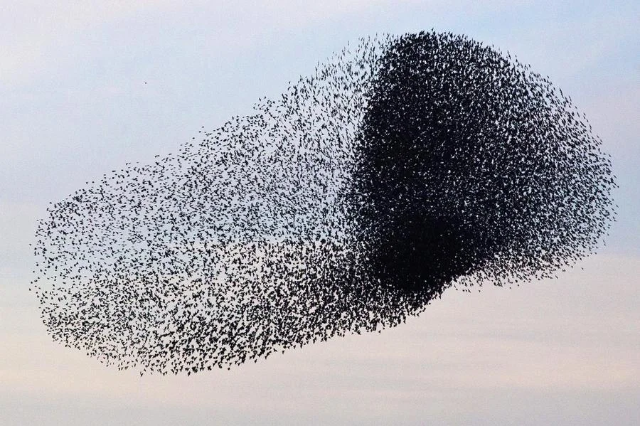 [Personal 2012] I saw them to the East lit in semaphore flashes by the falling Winter Sun, set against fluffy pink clouds flowing languidly inland. Moving together as a fluid, mercurial and quicksilver, this way and that, a coordinated dance of shiny metallic starlings. They seemed to circle chaotically over some unseen attractor below.